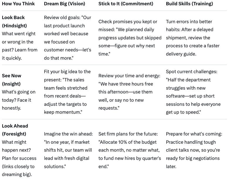 Together, they integrate thinking with doing. Sustainable change is influenced by how a leader thinks over time (looking back, now, and ahead) and acts to spark change (dreaming big, sticking to it, and building skills). Think of it as a Think x Act Matrix.